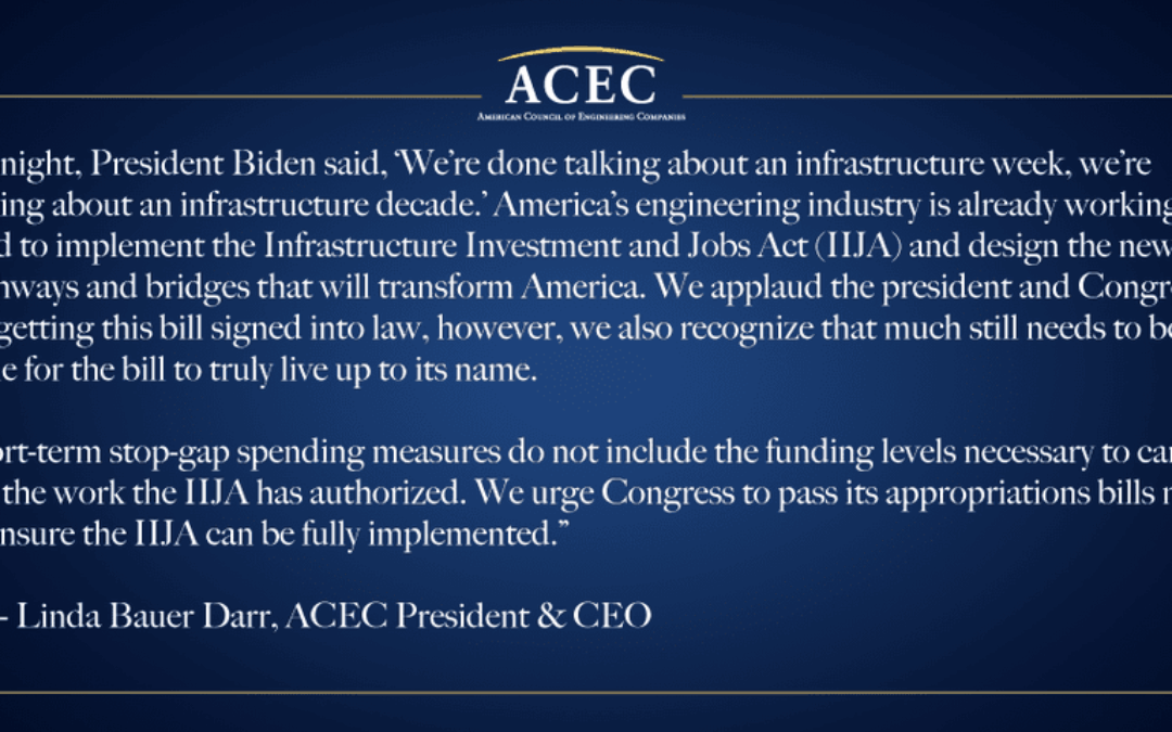 “Tonight, President Biden said, ‘We’re done talking about an infrastructure week, we’re talking about an infrastructure decade.’ America’s engineering industry is already working hard to implement the Infrastructure Investment and Jobs Act (IIJA) and design the new highways and bridges that will transform America. We applaud the president and Congress for getting this bill signed into law, however, we also recognize that much still needs to be done for the bill to truly live up to its name.
