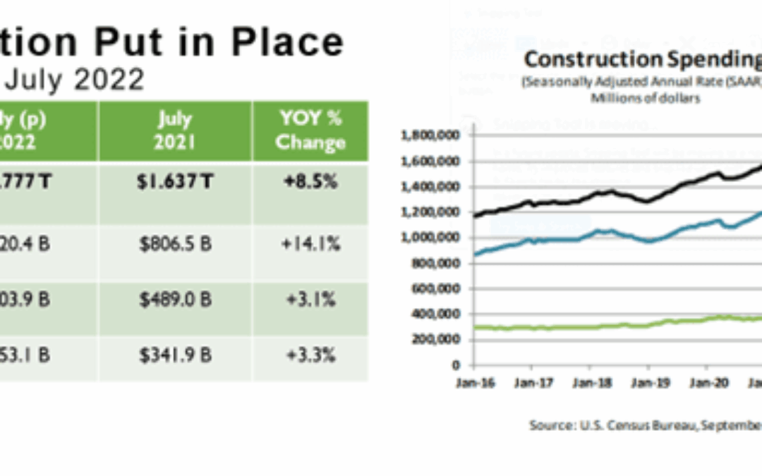 Each month we will report the Construction Put in Place numbers released by the U.S. Census Bureau. The data includes design and construction spending for both private and public sectors. The latest data was released on September 1, 2022, covering data from July 2022. For July of this year, total design and construction spending was up year-over-year by 8.5%, compared to the same month last year. This is largely due to an ongoing trend of increased residential spending which is still up over 14.1%. Private non-residential is up 3.1%, year-over-year and public spending is now up 3.3% year-over-year compared to this time last year.