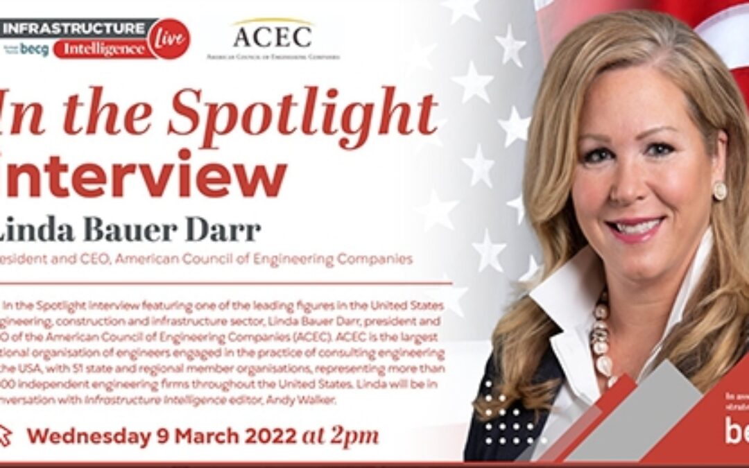ACEC President & CEO Linda Bauer Darr participated today in a wide-ranging interview on the Infrastructure Intelligence webcast in the United Kingdom, sharing her views on the transformational impact of the Infrastructure Investment & Jobs Act, the importance of advocacy in ACEC’s mission, her focus on boosting the image of our industry as a thought leader, and many other issues.