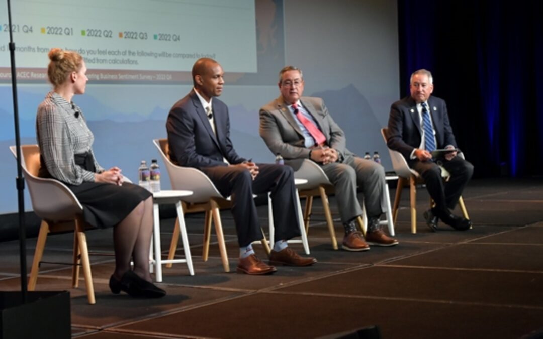 Following ACEC Research Institute’s presentation on their annual economic outlook, leaders of three Member Firms joined a panel moderated by Research Institute Chair John Carrato to offer firm perspectives. Panel participants included Alyson Watson, CEO of Woodard & Curran, in Portland, ME; Keith Foxx, the principal of FOXXSTEM, Washington, D.C.; and Mitch Simpler, managing partner emeritus, of Jaros, Baum & Bolles (JB&B) in New York. Carrato spared no time in diving into the discussions of what it is that these chief executives fear, favor, and anticipate as economic conditions for the engineering industry adapt to the impacts of inflation, worker shortages, and the impact of a recession. He kicked off the discussion by asking a very pointed question: “If we have a recession in the U.S., do you think it would affect the engineering and design services industry and what, if anything, is your firm doing to plan for the potential of a recession?” “My firm is all private sector, so a recession for us will have significant impacts because our clients have already started throttling back,” noted Simpler. “Private sector firms rely on private sector developers and businesses to provide our business. But, when a recession starts to loom, they start reducing the amount of money they spend. They start slowing projects down,” he added. Watson noted that her firm has both public and private sector clients. “In the private sector, we are seeing some budget contractions. Whether recession will be significant, some of our clients will cut back on their budgets. So, we are very actively prioritizing…which clients we want to be with, lock step, through recession and come out stronger on the other side.” Watson elaborated that her firm is monitoring client buying patterns, the weight of operational versus capital expenditures, and adopting business models including infrastructure-as-a-service, among other strategies. With regards to the public sector, Watson alluded to prospects of Woodard & Curran and similar firms based on the windfall of funds promised by the Infrastructure Investment and Jobs Act (IIJA) being more bullish compared to private. Keith Foxx, who called himself a “newcomer” to such a Member Firm leader panel, outlined that he has no negative opinion on the IIJA, or really any negative sentiment towards a potential recession in the next year or so. “We just see good things for the next ten years. The huge amount of funding that we see from the IIJA will support small businesses in this industry. It seems like its trickling, but it’s coming,” Foxx said. “Our firm is less than two years old, so we are in a unique position where we haven’t gone through a recession yet,” Foxx said. “Our client base is mostly public sector, [Department of Transportation] work, and they have not talked about a recession, not once. So, I have a very positive outlook with regard to a potential recession,” he added, joking with Simpler over the decision to be bullish or bearish coming up. Reserved optimism about IIJA was a common theme among the panelists. Simpler, for example, said that he is concerned over the impact of IIJA funds being dispersed to public sector projects while the private sector reels from an economic downturn. However, Simpler said that IIJA would benefit the engineering and design services industry as a whole, indicating a clear hesitancy. Foxx and Watson, both being C-suite heads at Member Firms dealing with a healthy public sector business, believe that IIJA funds would bring in new lines of business and opportunities.     All comments to blog posts will be moderated by ACEC staff.