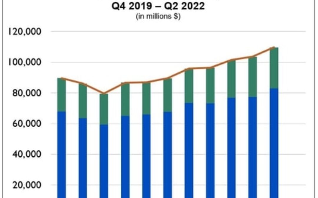 Total A/E revenues reached a new all-time high in Q2 2022 at nearly $110 billion, as reported by the U.S. Census Bureau on September 8, 2022. If you follow our regular updates, you may recall that A/E revenues just reached an all-time high of $104 billion in Q1 2022. This is the 8th straight quarter of consecutive growth after dipping in Q2 2020 due to the pandemic induced recession. Engineering services led the A/E firm revenue growth with a 7.3% increase from Q1 to Q2 2022 and architecture services increased by 1.3% from Q1 to Q2 2022.