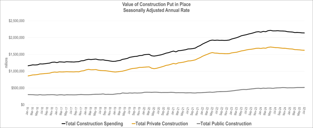 The seasonally adjusted annual rate of $2.14 trillion for July 2025 represents a monthly decline of -0.1%. This year has seen a slow decline in spending as July was the 6th consecutive month with year-over-year declines at -2.8%.