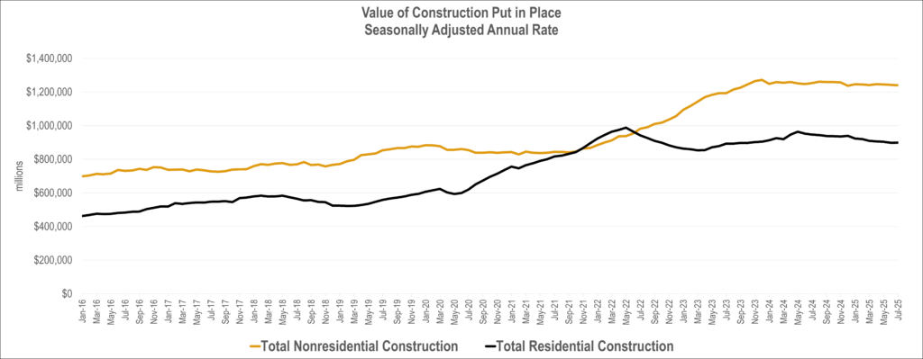 Factors such as higher-for-longer interest rates, changes in fiscal policy, trade uncertainty and other economic conditions are impacting markets to varying degrees. The residential market improved slightly at 0.1% for month-over-month growth while the nonresidential market declined -0.2%.