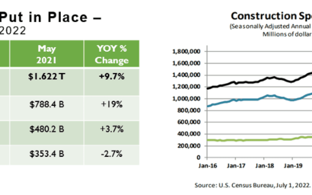 Each month we will report the Construction Put in Place numbers released by the U.S. Census Bureau. The data includes design and construction spending for private and public sectors. The latest data was released on July 1, 2022, covering May 2022. For May of this year, total design and construction spending was up year-over-year by 9.7%, compared to the same month last year. This is largely due to an ongoing trend of increased residential spending which is still up over 19%. Private non-residential is up just 3.7%, year-over-year and public spending is now showing a slight decline of -2.7% year-over-year compared to this time last year.