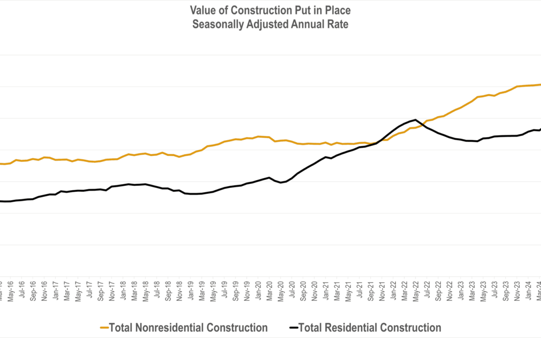 The overall flattening of topline growth masks the underlying variance of sector-specific growth. Two factors – higher for longer interest rates and changes in fiscal policy – account for this variability. The residential market continues to weather higher mortgage rates, though its resiliency is waning, showing a -0.5% decline month over month. The nonresidential market showed a slight increase at 0.1%.