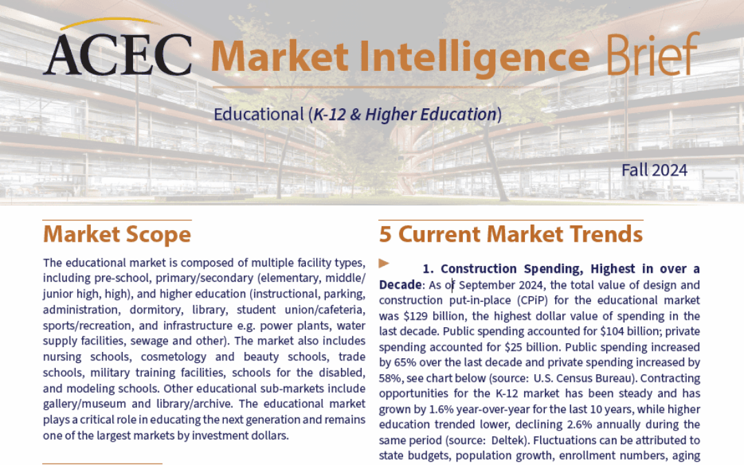 The educational market is a cornerstone of societal progress, encompassing a diverse range of facility types—from early childhood education centers to expansive university campuses. With over $129 billion invested in 2024 alone, it’s clear that this market is thriving and evolving. ACEC’s Educational Market Brief dives deep into the key trends and opportunities shaping this essential industry.