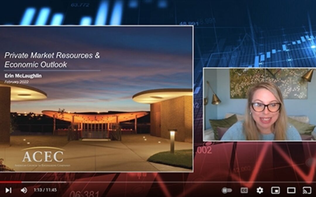 ACEC Vice President for Private Market Resources Erin McLaughlin presents the latest Private Market Resources & Economic Outlook on the YouTube Channel.
