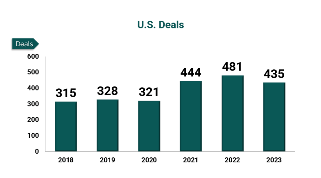 Despite a decrease of 9.6 percent from the record 481 transactions announced in 2022, overall market activity remained significantly above long-term historical levels. Notably, 2023 marked the third consecutive year—and only the third year in history—where U.S. deal volume surpassed 400 transactions.