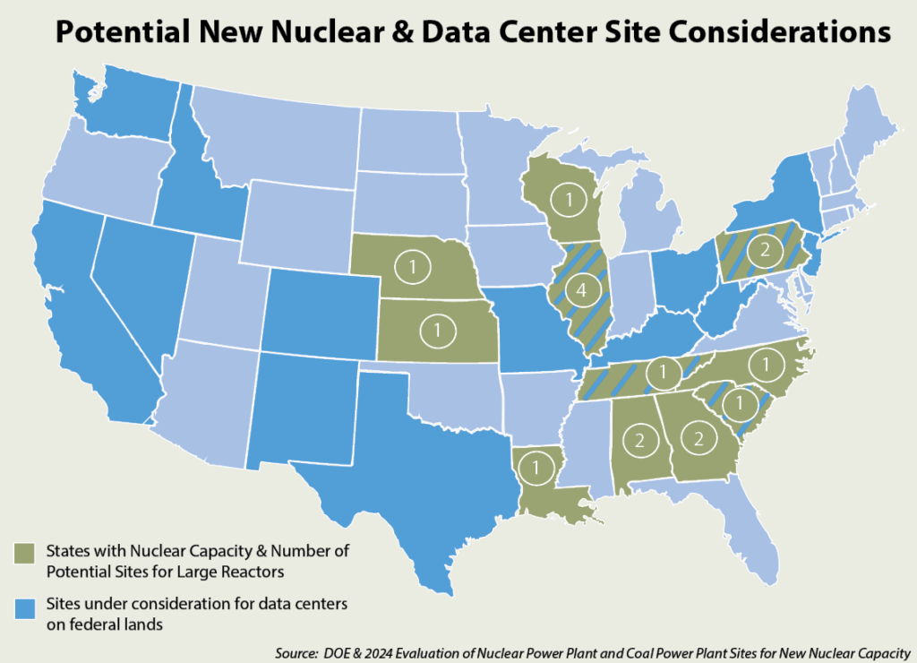 With rising electricity consumption, nuclear power is emerging as a potential player in supporting stable, uninterrupted operations for data centers. Large-scale nuclear facilities can offer consistent baseload power, minimizing fluctuations and vulnerabilities tied to intermittent energy sources like wind and solar. Recognizing this potential, data center developers are increasingly co-locating sites near nuclear reactors to ensure grid reliability. The Idaho National Laboratory, through a report created for the Department of Energy (DOE), identified up to 37 sites with potential for large reactor expansion, reinforcing nuclear’s potential role in fortifying energy infrastructure. See the map for 17 operable Nuclear Power Plant (NPP) sites with the potential for an additional large reactor.